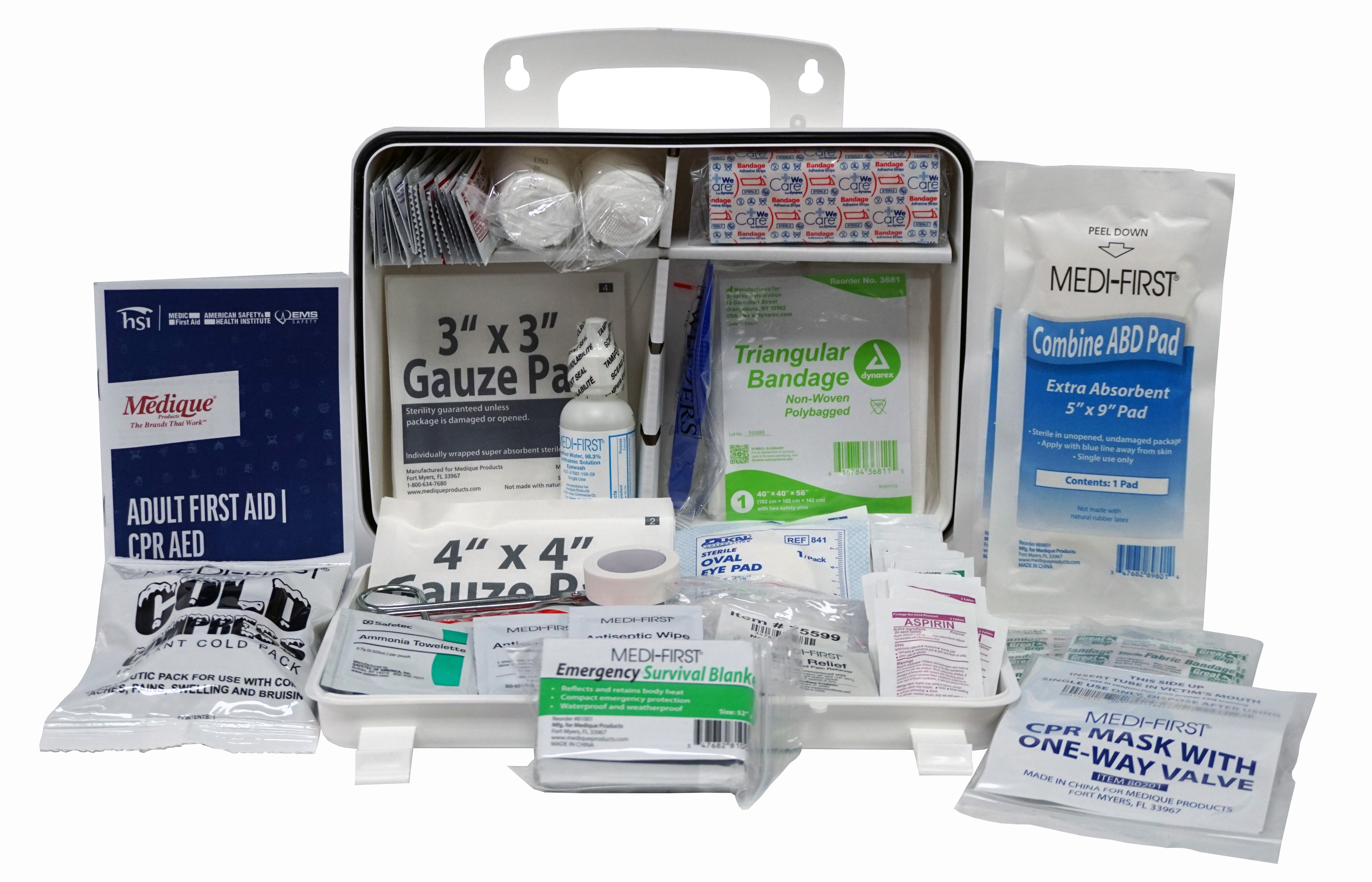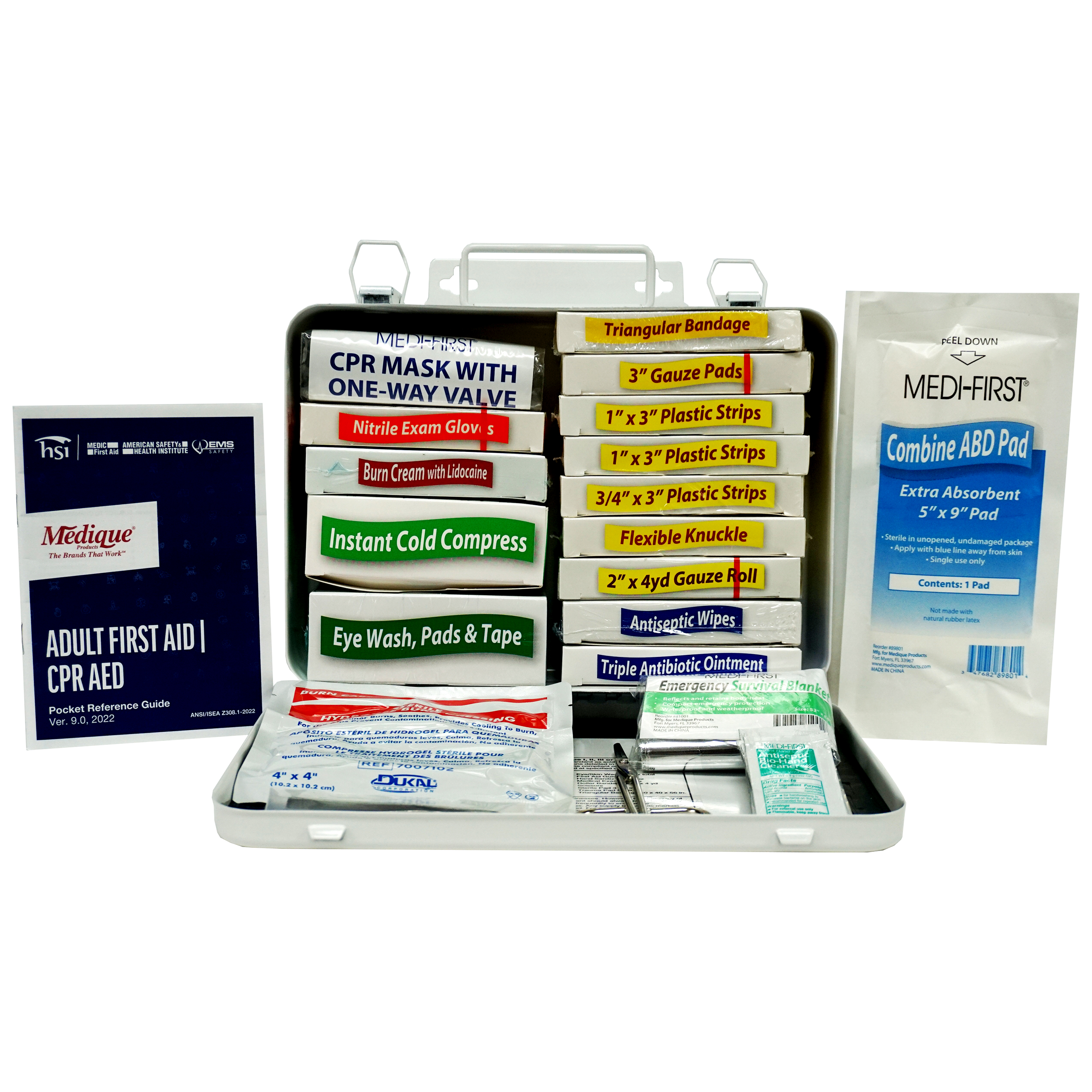 Provides first aid for up to 50 people and is perfect for any small office setting. Portable and wall mountable. 756ANSI....Filled (Meets ANSI Z308.1-2021) |