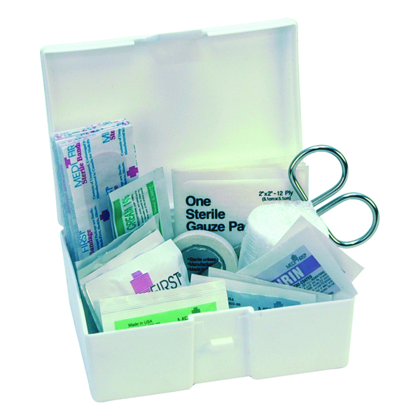 5" x 3-1/2" x 2" Portable plastic kit filled with the basics for treatment of cuts, scrapes and abrasions. 729P1....Filled |