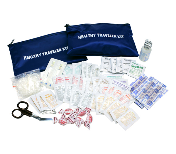12" x 8" Created specifically for international travel, each large blue nylon zippered bag contains an assortment of unit dose medications, minor first aid items such as bandages and unit dose topical medications, elastic wrap, triangular bandage and more. Contents poly-bagged for easy organization. 77501....Filled |