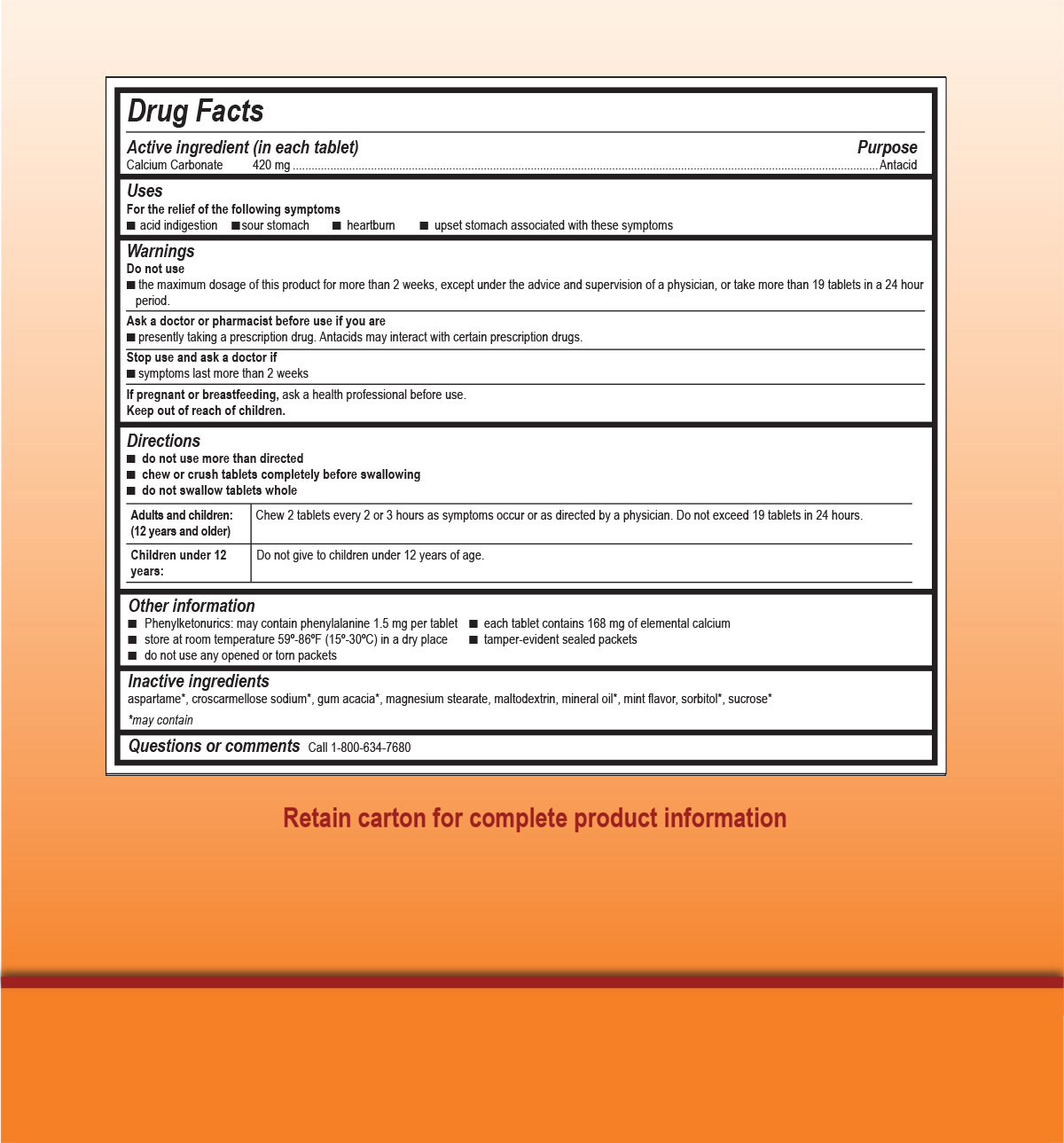 Aluminum-free calcium supplement for heartburn, sour stomach, acid indigestion and upset stomach. Mint flavor.